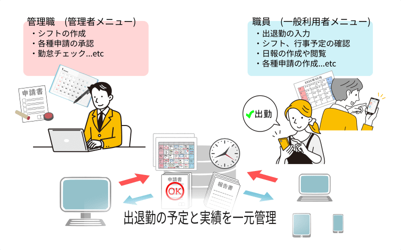 タイムカードの打刻による出退勤や、紙やExcelで管理していた時間外や有給休暇の申請などを一元管理したいというご要望に対応した機能を導入しました。