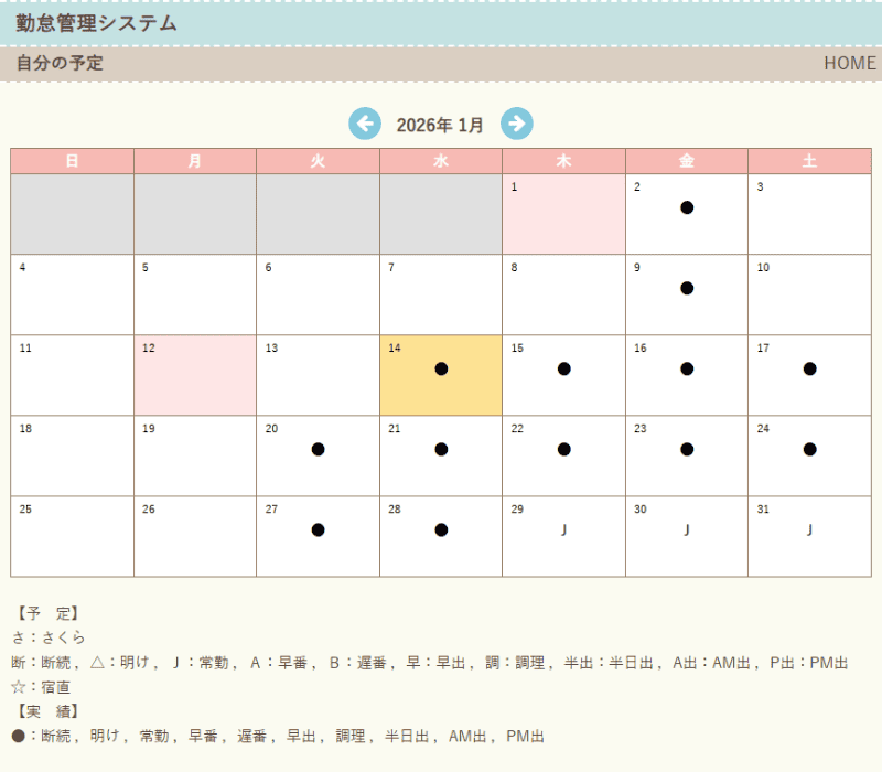 予定機能 :管理者による予定入力と閲覧専用の予定表