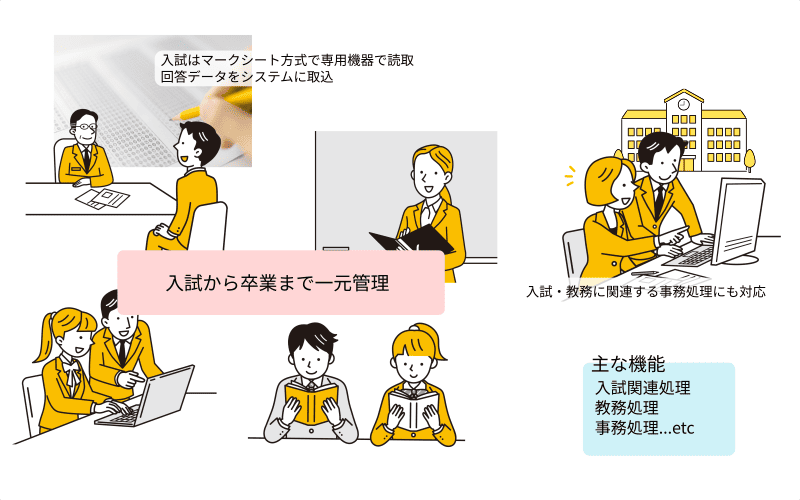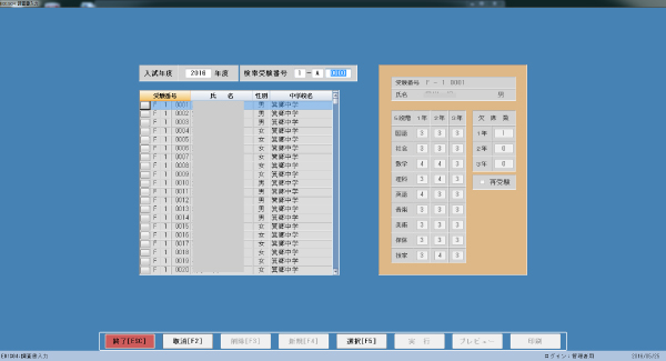 入試願書受付入力、調査書入力、入試得点入力、試験結果通知書発行